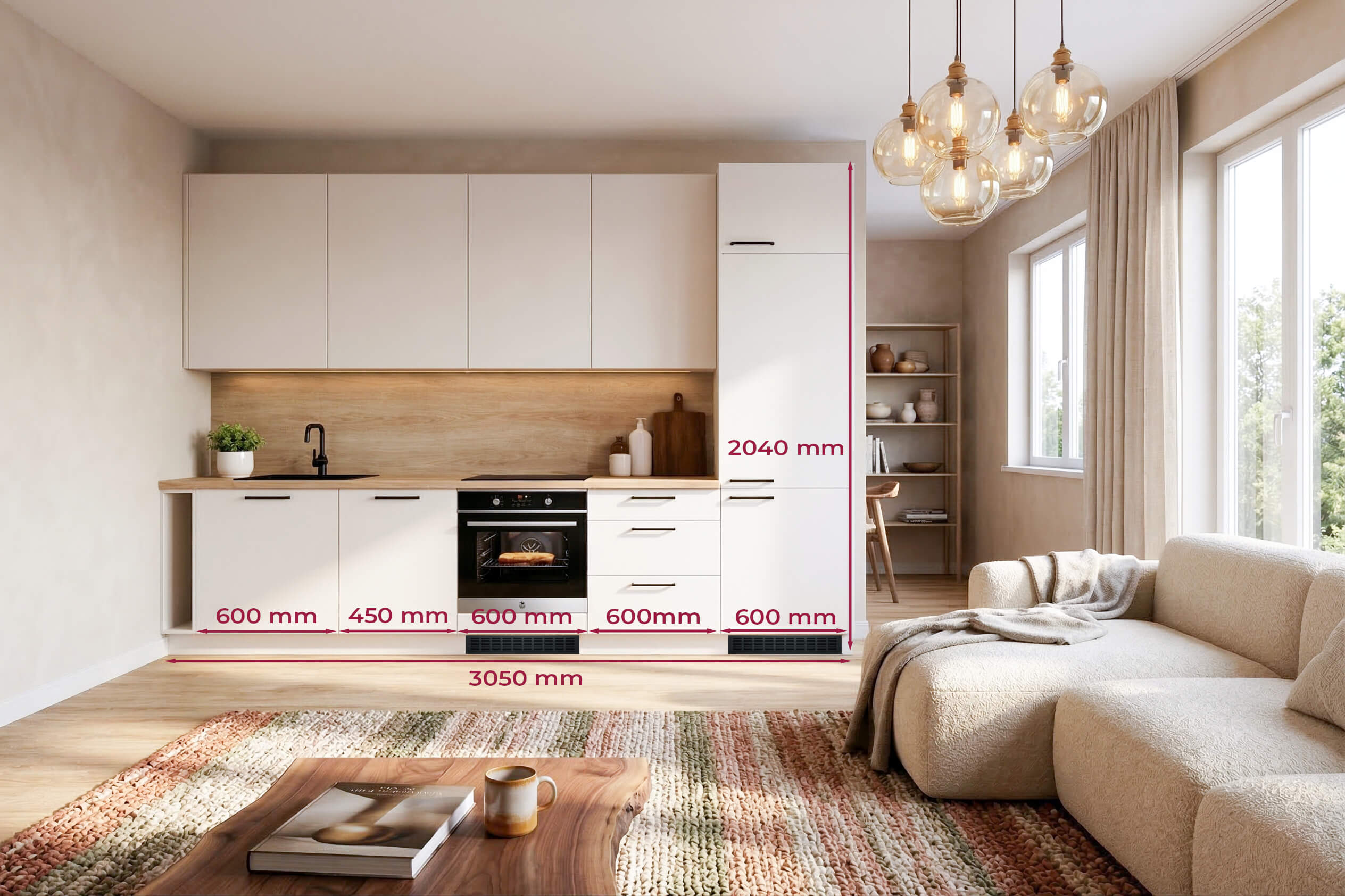 Kõik, mis vaja on kohe olemas! Isegi prügikastid, lusikakast ja rätikuhoidja. Soovi korral saad juurde valida taustaplaasi ja kogu vajaliku köögi- ja sanitaartehnika.